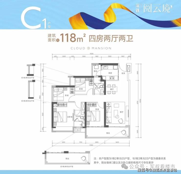 (C1户型,1栋2单元/3单元03户型),进门独立玄关,客厅3.5米开间,LDKB一体化设计,动静分区,四开间朝南,4个卧室分别做到了主卧15.3㎡/次卧10.22㎡/次卧7.52㎡/次卧6.83㎡(包含墙体飘窗),客厅连接次卧出6.4米长的大阳台,二字型厨房带1个生活阳台。