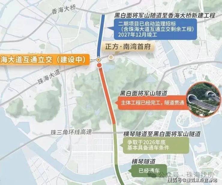 未来周边小区业主即可在该区域完成调头,避免了绕行前行调头的问题,黑白面将军山隧道至香海大桥:2024年10月16日,官方公布了该段及珠海大道互通立交剩余工程的招标信息,计划2027年12月竣工。