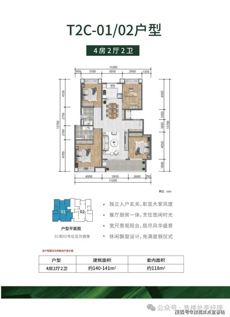 :4 房 2 厅 2 卫,建筑面积约 140 - 141m²,套内面积约 118m²。独立入户玄关彰显大气,餐厅厨房一体方便烹饪,宽尺景观阳台可揽尽美景,还有休闲飘窗,充满度假仪式感。