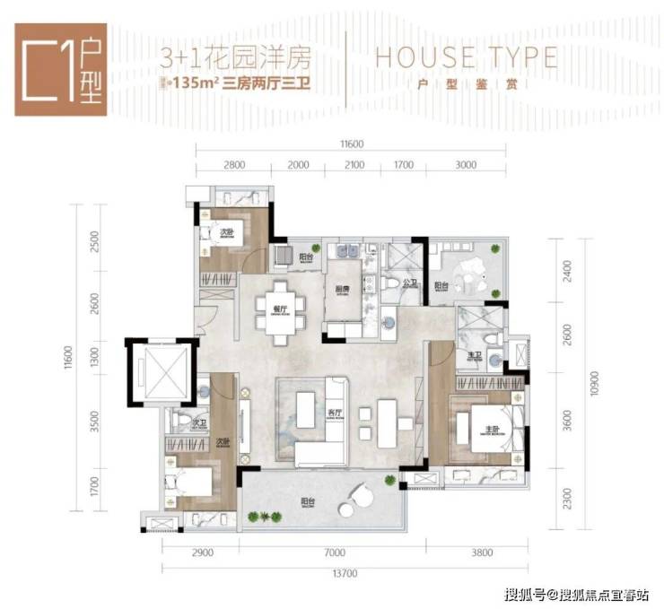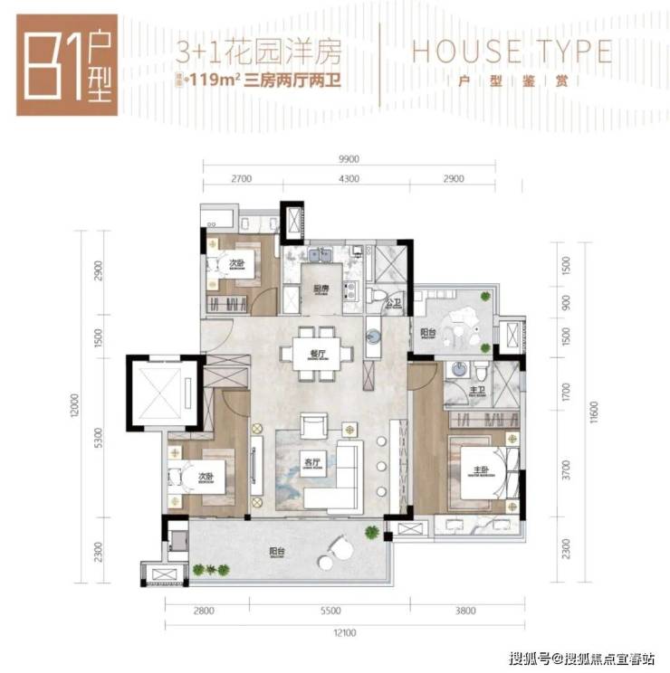 必买价值八【优享户型】:约108㎡3+1纯板房,明厨明卫双阳台,全家均享独立度假空间。