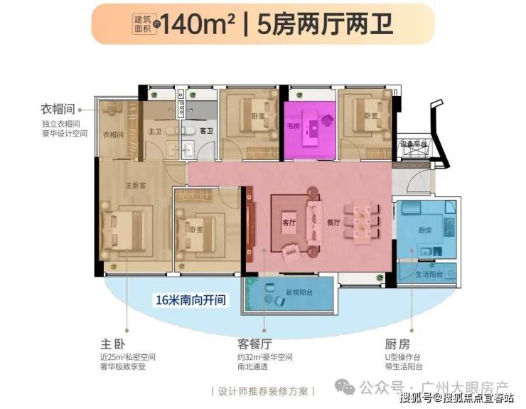 【140㎡5房2厅2卫】南北对流,约32m²阔绰客餐厅,约16米南向五开间,享央景园林约25m²豪华主卧,带独立衣帽间