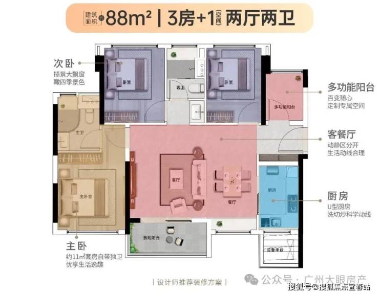 【88㎡3+1房2厅2卫】经典竖厅格局,三开间采光,近11㎡主卧套房设计,优享生活逸趣,稀缺小户型,低总价晋阶天河