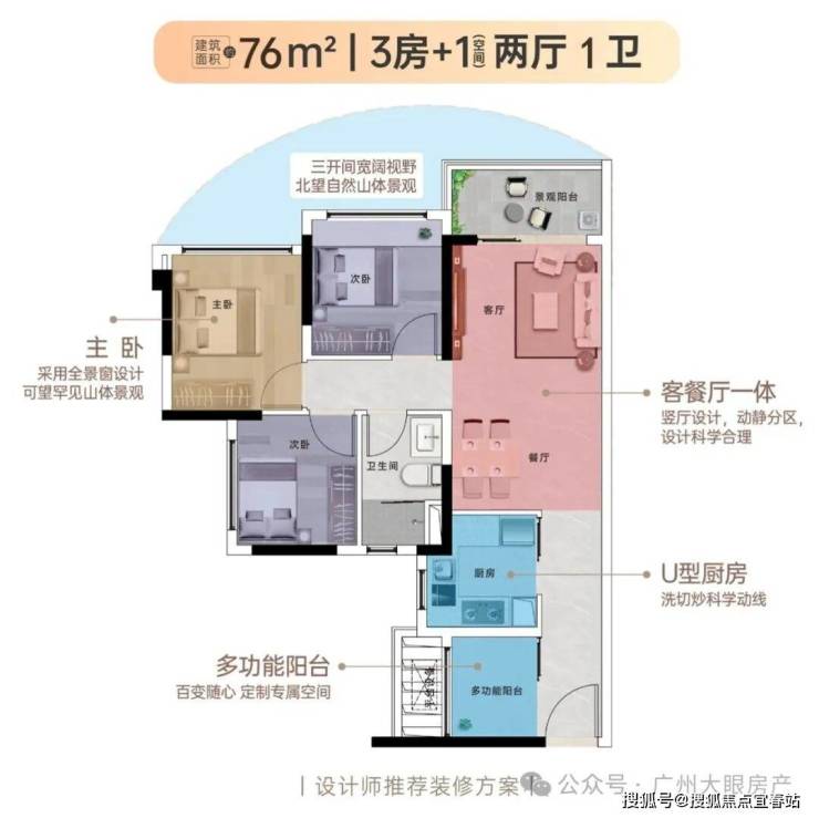 【76㎡3+1房2厅1卫】餐厅、客厅连通布局,低总价晋阶天河