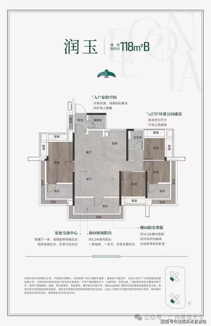建面约118㎡(B户型)4空间2厅2卫,带入户家政空间,四开间朝南,约14.5米大面宽,通风采光好,阳台、客厅长约6.2米,北向次卧带270°飘窗,可望中央公园景观。