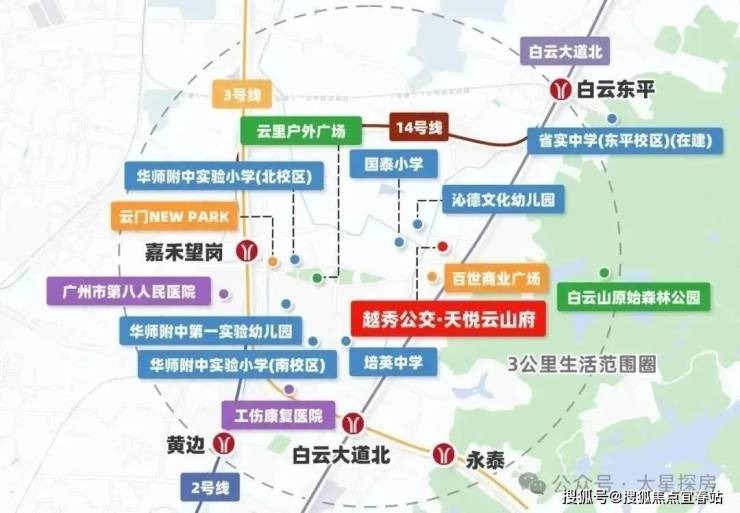 白云新城CBD千亿红利中轴:白云新城规划的CBD,白云山景观,超200万㎡商业圈,TOD枢纽立体交通,顶尖教育资源环绕,三甲医院环绕,极致云山观景体验" 【公交】打造首个全新的公交TOD模式,项目整体抬高18米,楼下架空层为阳光观景车库和阳光公交站场,下楼即上车,到站即归家,解决回家最后一公里问题,在车库也可以看一线云山景;【地铁】地铁2号线、3号线、14号线,半小时通达广州主城中心生活圈;还预留公交站场与佛山地铁6号线地下衔接通道,未来将实现集公交、地铁一体化换乘。