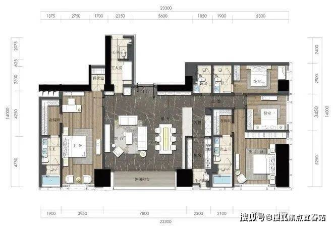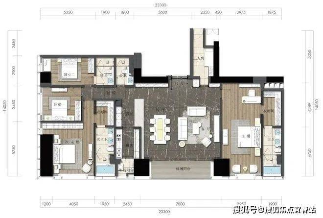 D2户型:约340㎡4房2厅4卫:B栋28-52F(高区),东朝向,户型与343㎡户型基本相同。