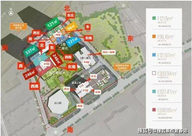 项目位于福田区沙头街道新沙路18号,项目由3栋超高层建筑及1栋多层建筑构成,包含回迁房、保障房、商品住宅、酒店及商务公寓等业态,配建一所幼儿园,旁边规划建设一所小学。1栋由回迁房与保障性住房组成,64层加地下3层,楼高196.8米。2栋为商品住宅,59层加地下5层(含两层半地下室),楼高189.15米。3栋由酒店、商务公寓、人才住房组成,40层加地下4层(含一层半地下室)楼高172.85米。本期销售住宅有260户,其中户型套内建筑面积小于90㎡为230套,占比88.46%。