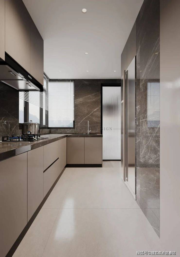 餐厨区以低饱和色调与质感材质,编织意式烟火篇章。浅灰柜体与深棕岩板呼应,玻璃柜门简约通透,内置灯带勾勒陈列层次;圆形餐桌配绒面餐椅,围合出温馨场域。另一侧烹饪区,延续色调统一,大理石台面简洁大气,功能布局清晰;下厨、用餐动线自然,每一刻都似在品味意式生活的优雅温度 。