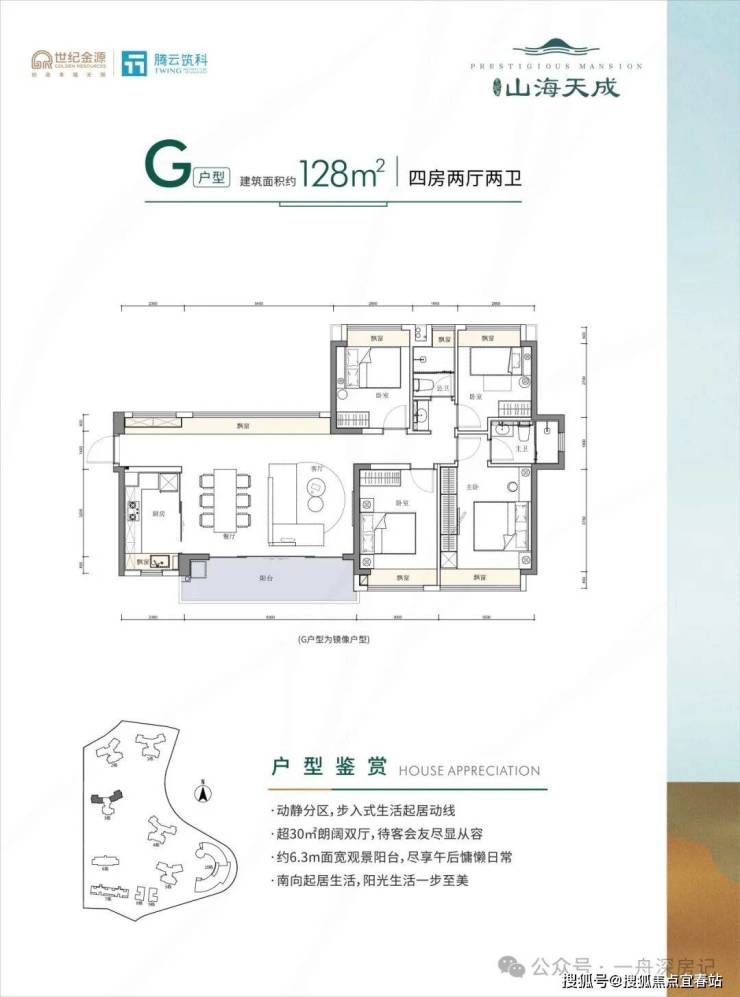 产品面积为89㎡三房,106-109-112-128-129㎡四房,141-151㎡复式,户户朝南,户型的使用率基本都能达80%左右,除了89㎡户户都有6米宽左右大阳台。
