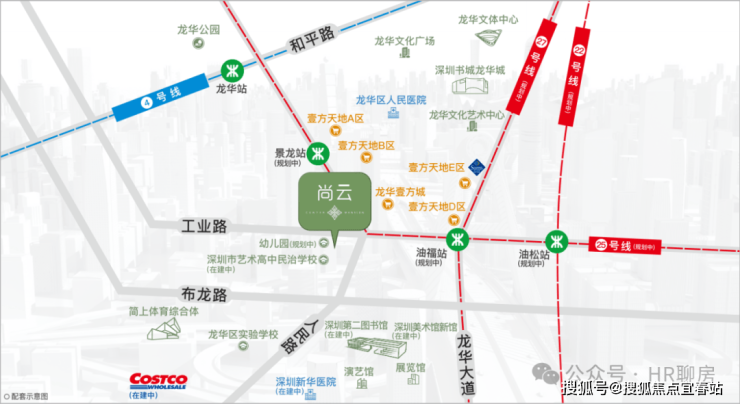 4号线(已开通):龙华站直线距离约1000m,深圳纵向城市交通中轴。