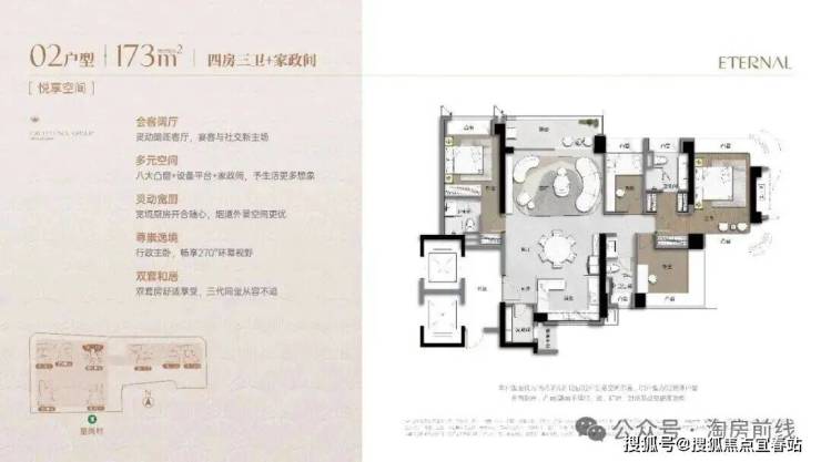 173㎡ 4+1房+3卫:高端改善户型,配备环幕尊奢主卧、独立衣帽间及双卫浴,北区大户型还有双电梯独立入户,私密性有保障。