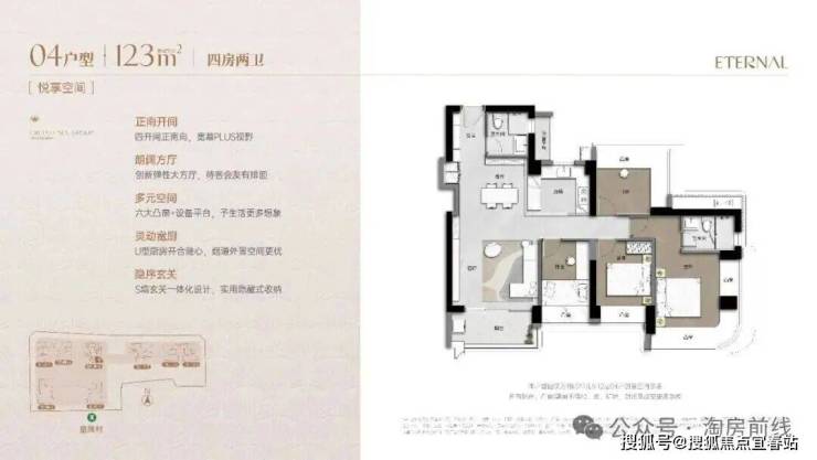 项目123㎡产品,实现了4房空间构造,同时还保证户型南北通透同时4个空间为南向开启,产品构造上通过凸窗延展了景观面,是市场上极少见的南向优质产品。