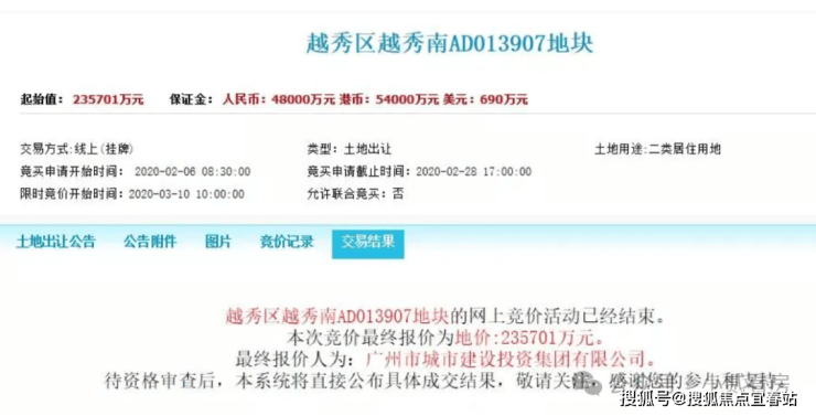 广州城投·东园公馆所在的越秀区越秀南AD013907地块,为2020年3月广州城投以235701万元竞得,扣除1.3万㎡的配建面积后,折合楼面价64576元/㎡。