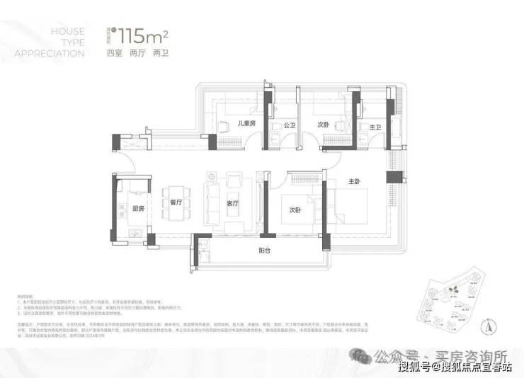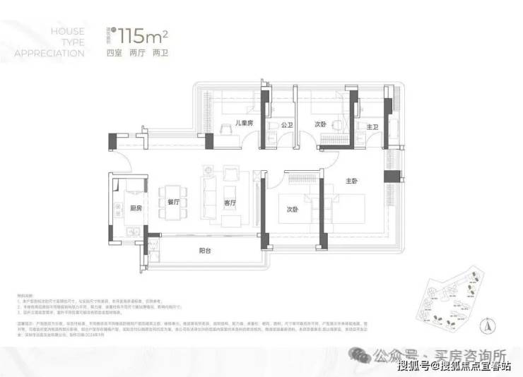 115㎡户型使用率约80.8%,抛去墙体+飘窗+全部阳台使用率达到85.28%