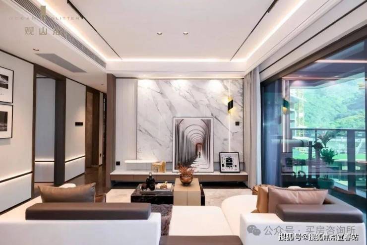 越往里步入,越能感受到归家即入山境的奇妙感受。目之所及的大南山盛景、流淌雅致之美的轻奢水院、绿意盎然的景观花园、静谧舒适的会客公区,都在移步异景间,传达着都市山居美学。