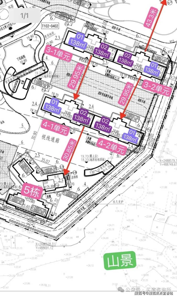 再就是楼间距问题,项目4-1单元南向阳台以及房间朝向距离前面5栋30.85米,北向飘窗房间朝向距离3-1单元29.95米,受一定的视野遮挡
