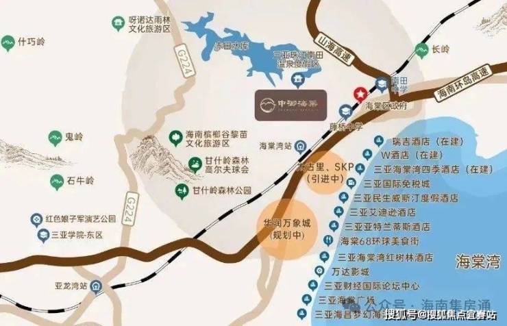 海棠湾是海南唯一一个由国家规划打造的度假湾区,定位为国家海岸,22公里海岸线汇聚千亿配套,32家超五星级酒店、4大主题乐园、5大高尔夫球场、310解放军医院海南分院、亚洲最大单体免税店、华润超级万象城、北京华联SKP等资源环伺。中御海棠项目位于海棠湾南田片区,坐享东线高速、山海高速、机场、高铁、城际公交等三维立体交通网,度假生活出行四通八达。