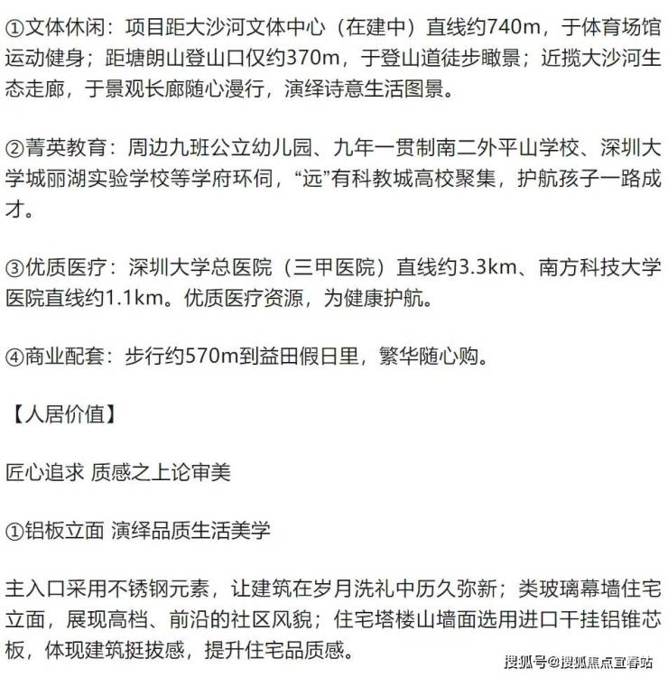 城市瞰台:背倚约15000亩塘朗山,远可眺香港,近能瞰西丽水库、福田、南山及前海等地,适合散步、登山,享清新富氧空气。臻美水岸:紧邻约13.7公里大沙河生态走廊,即深圳版“塞纳河”,处深圳最大滨水慢行系统,可漫步、骑行、垂钓,享受自然宁静。此外还有枢纽交通,高效畅达世界。