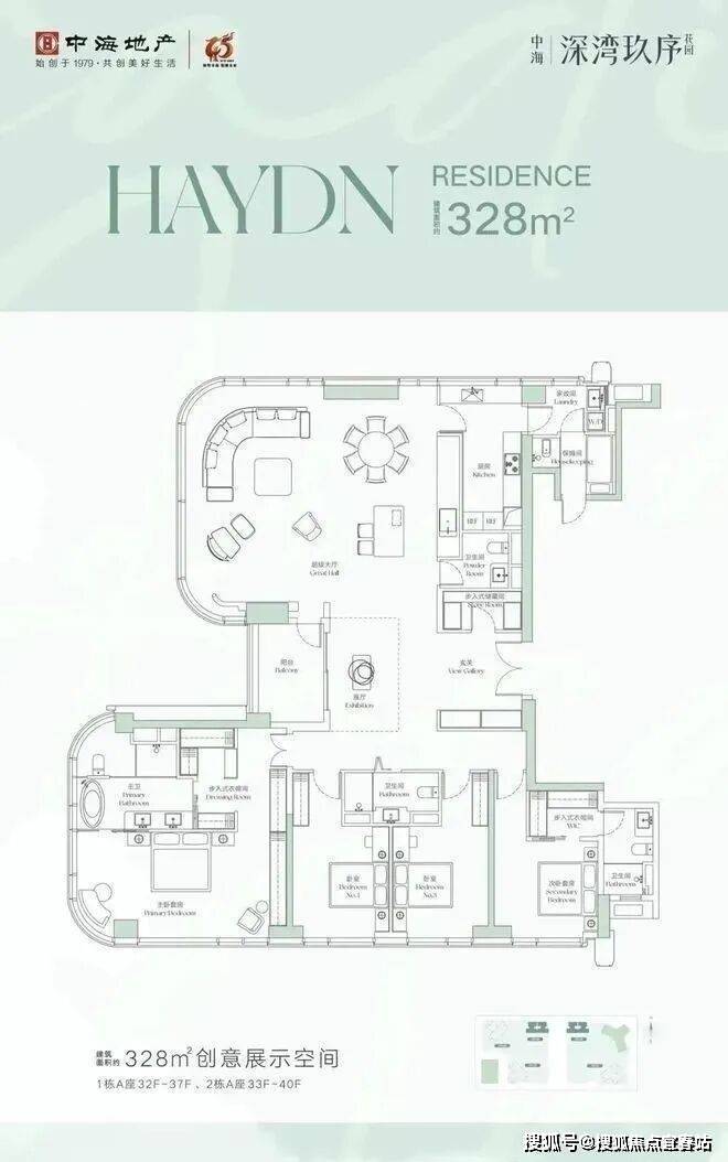 ①328平4+2房4卫,楼王户型,位于1栋A座01/02户,正南朝向,看小区园林景观。独立保姆套间,外立面采用270度玻璃幕墙,采光和通透好!