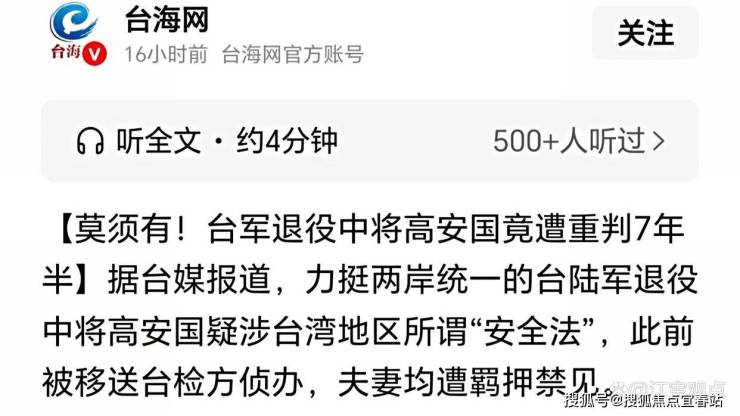 据@台海网10月23日援引台媒报道,力挺两岸统一的台陆军退役中将高安国,因涉及台湾地区所谓“安全法”,已被台湾高等法院重判七年六个月徒刑。同案其伴侣刘逸蓁被判六年十个月,其余多名人士也获刑。