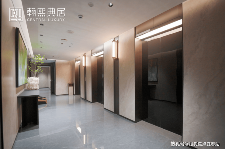又如电梯厅:大板通铺的岩板尽显档次,设置四梯五户的同时,选用日立电梯,梯速每秒5米,无需久等电梯。