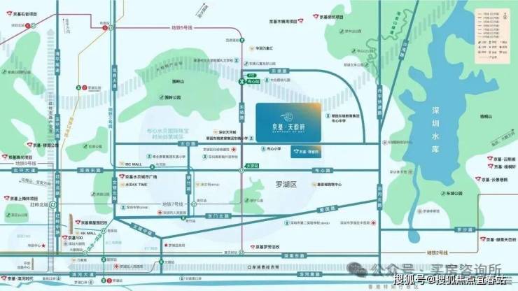 先抛开产品部分,京基天韵府的素质绝对不差,其位于罗湖区东湖街道仁心路与围岭中路交汇处西北侧,属于罗湖的老牌居住区——布心片区,周边配套十分丰富,距离地铁5号线布心站仅约200米,步行4分钟,实打实的地铁物业,出行非常方便。