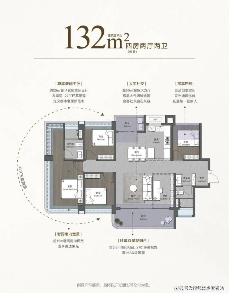 朝向:西南向16m超大尺度观景阳台,6.6m270°观景阳台,约30㎡超大主卧,270°全景飘窗