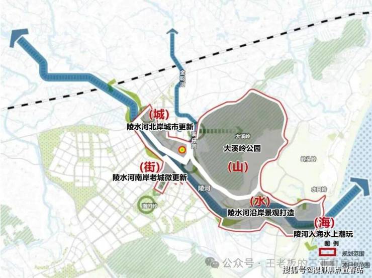 项目规划总面积约11.4平方公里,包括大溪岭公园(山)、陵河沿岸景观打造(水)、陵水河南岸老城微更新(街)、陵水河北岸城市更新(城)、陵河入海水上潮玩(海)五个子项目,整体项目依托陵水河开发,傍山邻水望海瞰街,形成以美好栖居、商业服务、产业办公为主,集“山、水、街、城、海”功能规划于一体的滨水理想新城中心。