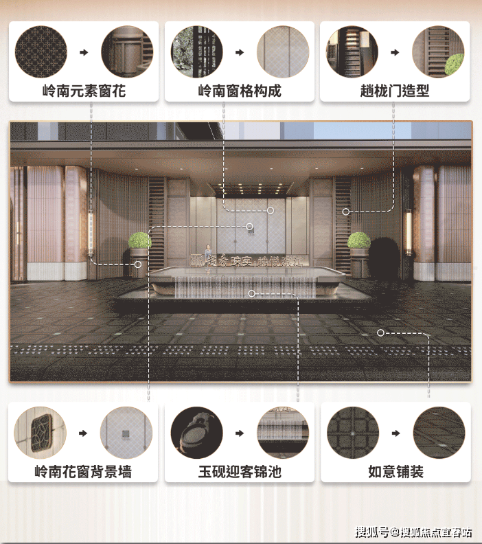 以四大名砚之首“广府端砚”为灵感打造迎客锦池,有青云得路、宏图大展的美好寓意,让业主每次归家都有满满仪式感。