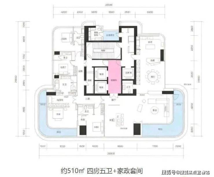 梯户比:顶级配置,如 A 栋 (510㎡) 为 3 梯 1 户 (专属电梯厅),B 栋 (370㎡) 为 5 梯 2 户,私密性与尊贵感拉满