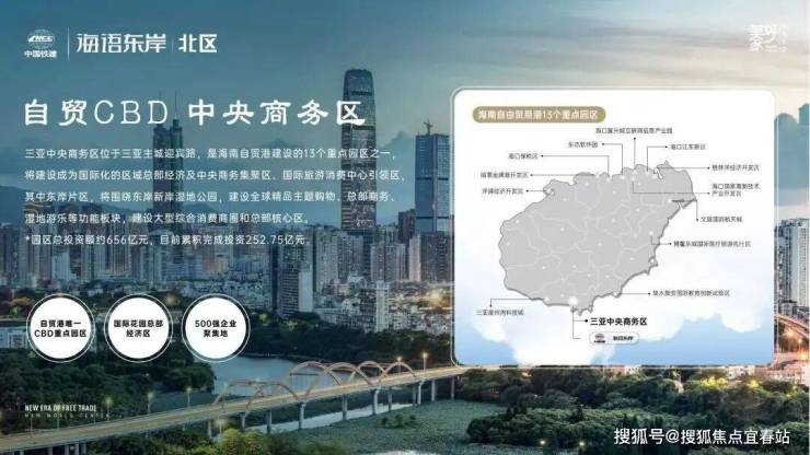 【区位】三亚东岸CBD 城市中轴资产 中国铁建·海语东岸位于三亚中央商务区东岸CBD单元(三亚中央商务区是海南自贸港11个重点园区中唯一位于城市核心区的园区)周边汇聚世界500强企业总部、国际一流商业集群,依托世界级空港群/海港/路网/城铁及轨道等多维路网,畅达三亚擎动世界。
