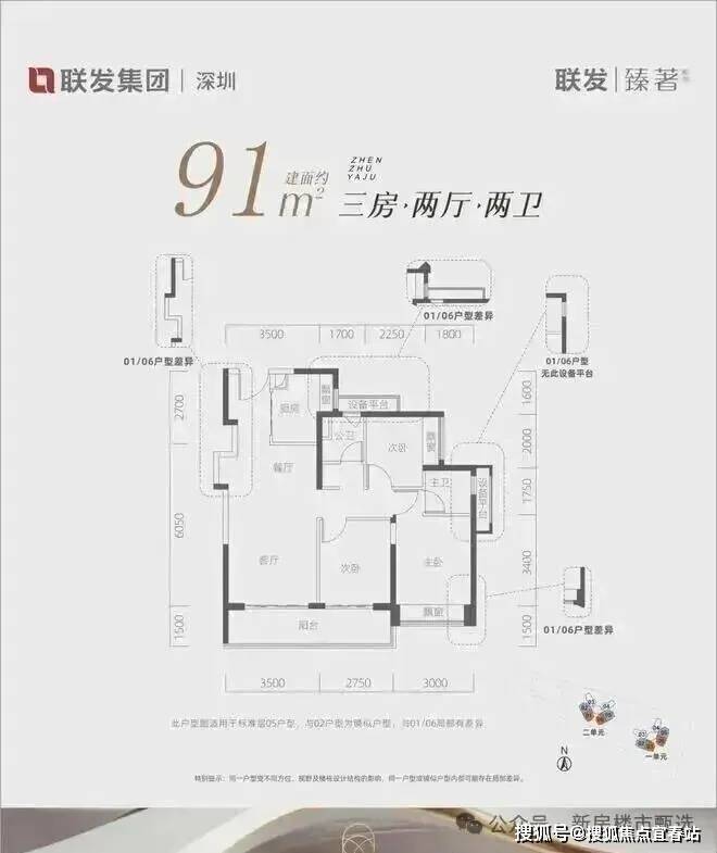 91㎡的3房2厅2卫,设计的是经典竖厅格局,客厅3.5米开间,三开间朝南,3个卧室分别是3米/2.75米/2.25米的宽度,U型厨房,公卫三段式分离设计,得房率:92.69%(包含赠送),阳台西北或东北朝向。