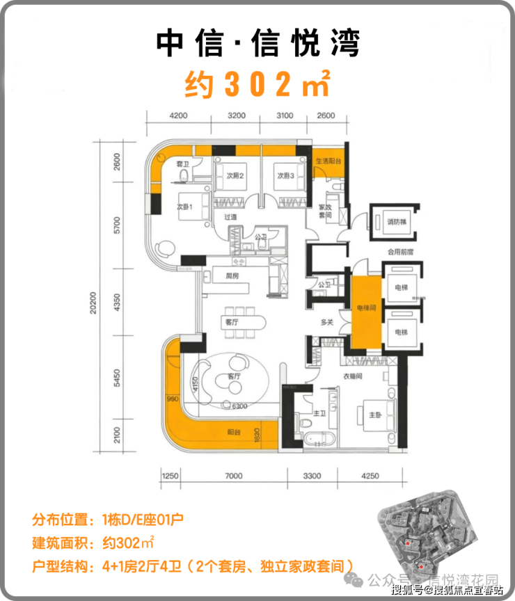 约302㎡户型分布在1栋D/E座,3梯2户,层高3.5米,4+1房2厅4卫配比。
