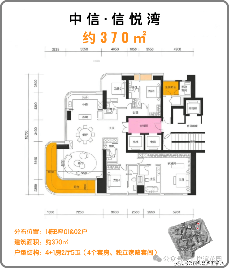 约370㎡户型分布在1栋B座,5梯2户,层高3.5米,4+1房2厅5卫配比。