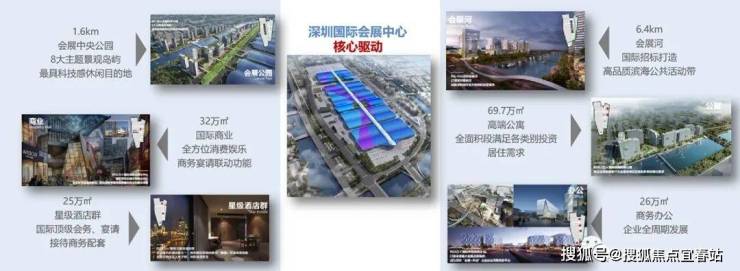 约160万㎡深圳会展中心,约154万㎡会展综合配套,形成包含城市地标、产业总部、商业中心、国际酒店群、产业展馆、精品公寓、生态公园、交通枢纽等复合功能物业群,构建集全球信息交流和消费体验于一体的会展商务平台。