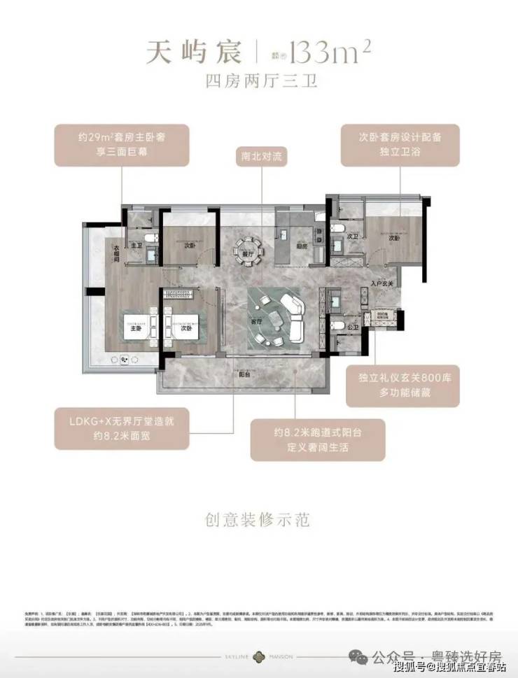 133㎡的4房2厅2卫,客厅5.4米开间,L型中式+岛台灵动式厨房,公卫三段式干湿分离,12.3m²的观景大阳台连接客厅跟次卧,阳台主朝东南或西南向,得房率约78.27%(不含赠送)。