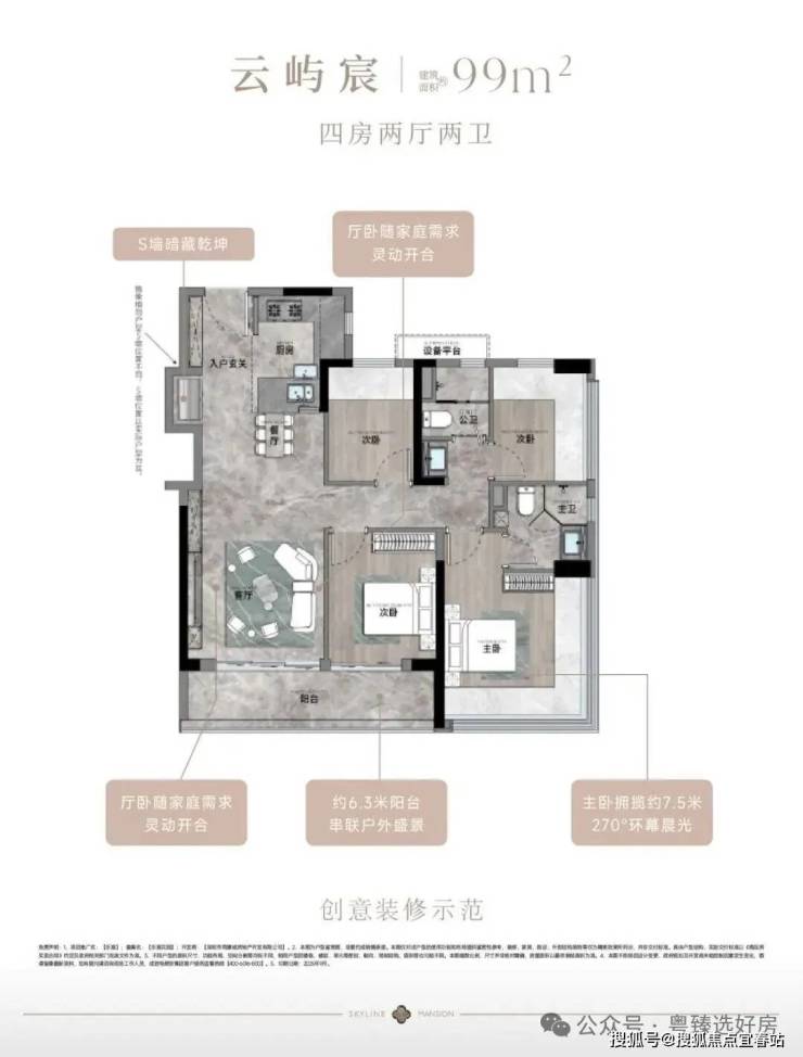 99㎡的4房2厅2卫,客厅3.35米开间,LDKB一体化,S墙设计预留双开门冰箱卡槽位,三开间朝南,U型厨房,公卫三段式干湿分离,9.37m²大阳台连接客厅跟次卧西南或东南朝向,赠送设备平台,得房率约78.27%(不含赠送)。