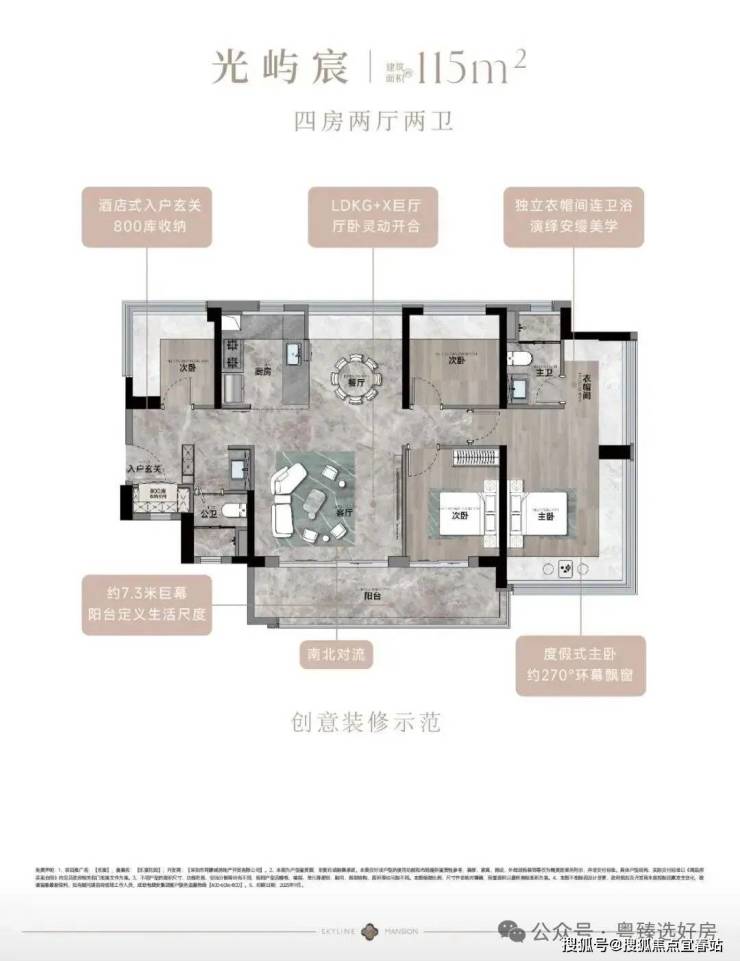 115㎡的4房2厅2卫,客厅4.45米开间,L型中式+岛台灵动式厨房,公卫三段式干湿分离,10.87m²的观景大阳台连接客厅跟次卧,阳台主朝东南或西南向,得房率约78.27%(不含赠送)。