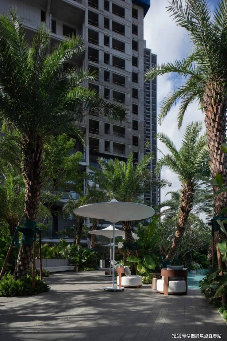 42米长核心赛道级泳池周边设置慵懒的沙发,藤编的躺椅,以及在姿态各异的银海枣下安放的风情伞座,让人可以随时享受度假体验。下沉的卡座被水和植物所包围,畅想自然间感受自然惬意与舒适。泳池一端的落日酒吧,一盏南阳风情的吊扇,悠悠转转,仿佛躺在北纬21°的日光里。植物从多彩的绿色变为与大地交融的橄榄绿沙漠花境植物,不同岩石颗粒与肉质感粗粝的沙生植物相互点缀,是热带风情的另一种诠释。置身沙漠里的度假酒店,演绎着骄阳里懒散又奢华的风情。