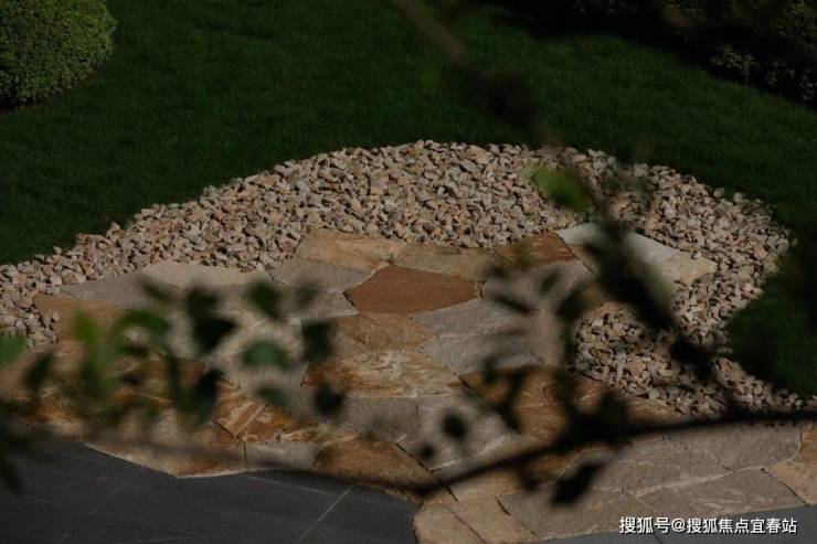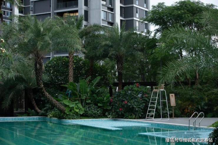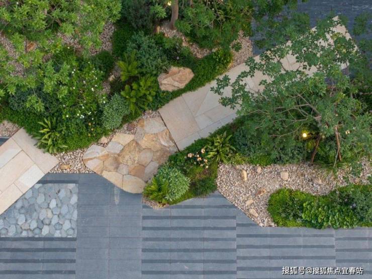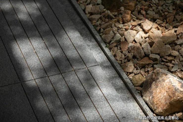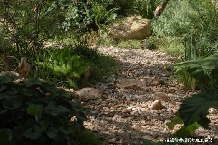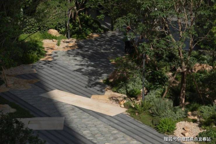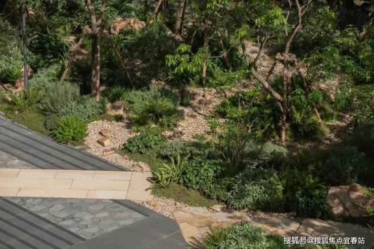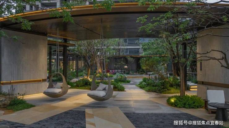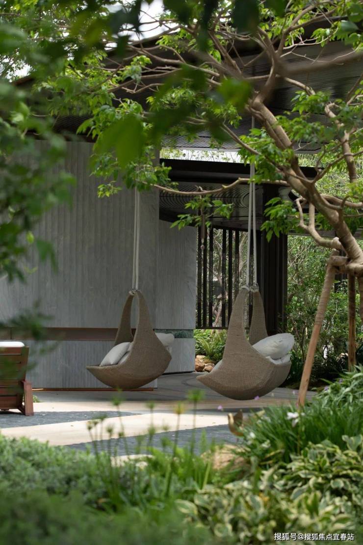 直径25米的圆形连廊虚实相间,构成无界森活模块,营造以森活舞台为核心的“三室一厅”。从山里移居来的高大丛生朴树模拟江门村口大树场景,在圆形的吧台坐下,聆听家乡的声音。整石的台阶在各色大叶植物的掩映下,热带风情与本土烟火气相互交融。园路、植物、家具小品无界融合为风铃雅聚,是森活舞台的延伸,吊椅藤萝,林下芬芳,在各色花卉里漫步轻语,在柏坡黄的石皮与自然融合的苔藓里驻足发呆。层层跌水流过整块奢石的曲面,在表面镀上了最细微的纹理。驻足远眺,与全季泳池无界融合,将视线的无限延展拉长,不同的情绪氛围在此切换。