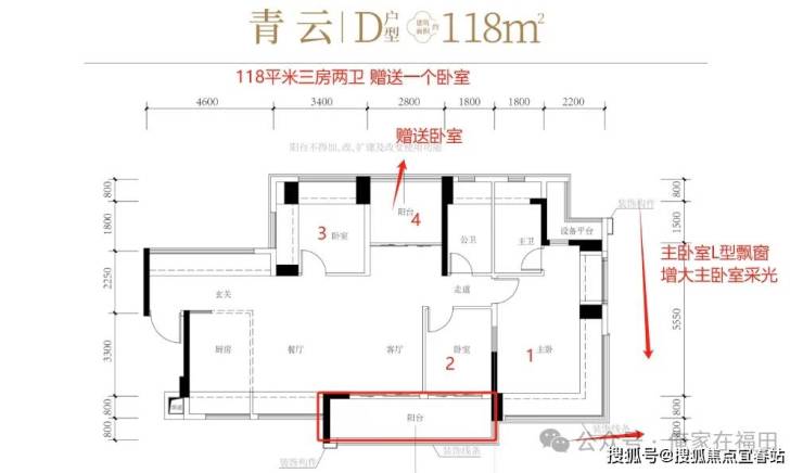 南北通透户型,横厅设计,客厅阳台与2卧室贯联 大阳台增加采光面积