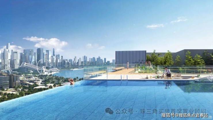 「顶层云端泳池」云端屋顶空间营造天际观海泳池、空中步道、草坪观影、观景吧台等,同频城市峯层的品味共识,塑造云端艺术领地,在此尽享舒适。