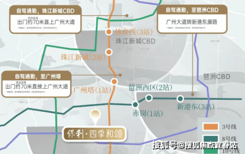 保利四季和颂周边拥有丰富的地铁线路,包括3号线、8号线、10号线和11号线四条地铁线,形成了便捷的交通网络。虽然四个地铁站距离楼盘都在1.5到1.8公里之间,但通过自驾或公共交通工具,居民可以轻松到达广州的主要商业区和生活圈。此外,楼盘靠近广州大道,驾车前往珠江新城、体育西、琶洲等地也十分方便。