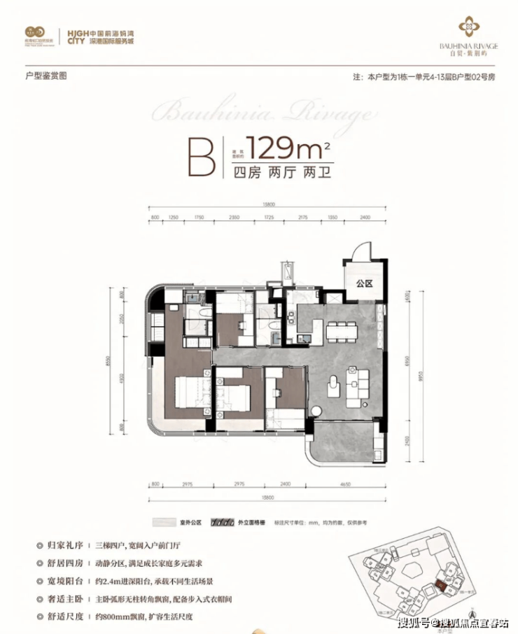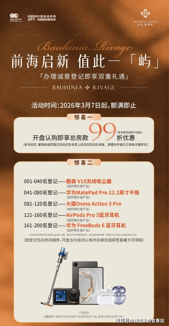 最新动态:前海妈湾湾啟紫荆府二期(紫荆屿)将于4月9日正式开放实体样板房,已诚意登记会优先参观),登记可享众多惊喜(参考下图),预4月中下旬开盘入市,面积段108-129-148㎡3-4房,售价预计在10-12万/㎡。