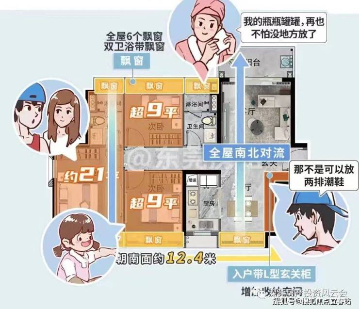 户型优点:全屋南北通透,拥有6大飘窗,多个正对的全面屏飘窗,让清风阳光,铺满室内,又增加了收纳空间。