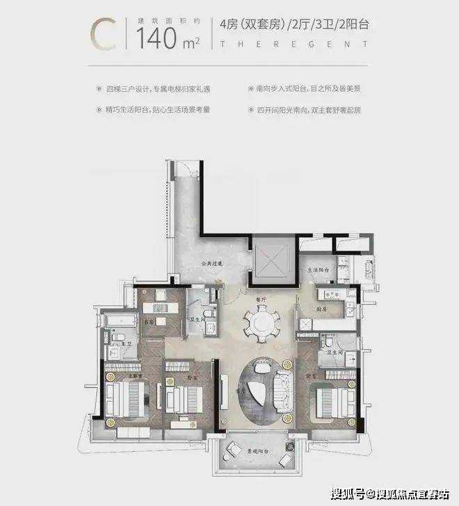 产品亮点:私家电梯入户、约3.4米层高、动静分区南北对流、约6.8米挑空餐客厅、中西双厨、三套房设计、部分房间带阳台设计