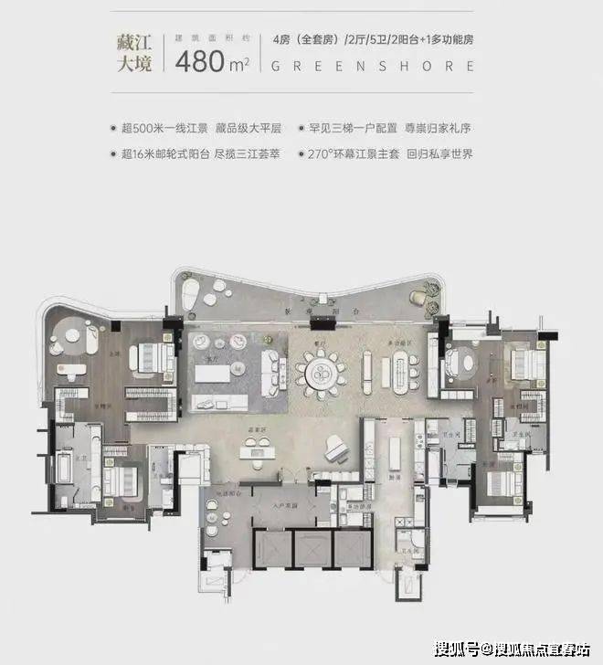 多元化产品线:涵盖140-480㎡江景大平层、叠墅(279-437㎡),其中叠墅实用率高达355%,配备私家电梯、入户花园及超大露台,部分户型首层花园达797㎡。