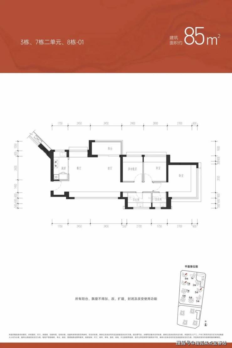 ①户型分析:小面积、低总价,最佳上车首选户型;全南向排布户型,多飘窗的设计,采光通风不错;户型方正,动静分区的设计注重隐私性;明厨明卫,三分离洗手间设计;②朝向:西南、东南向③视野:小区外围,临万丰路,看城市风景,施工建设区域【约85㎡三房两卫】户型分布:分布在7栋2单元、8栋、3栋,共710套,①户型分析:有横厅和竖厅两种户型,全屋7个飘窗、13米采光面,非常通透;预留超多收纳空间主卧双面采光,景观视野更开阔②朝向:东北、西北朝向③视野:社区花园和社区楼栋