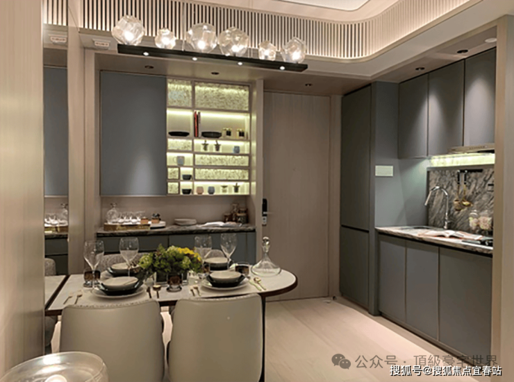 一入单位,大门旁边为开放式厨房,大门旁边摆放冰箱。厨柜以灰色柜门色板配撘上黑白色云石图案工作枱面,而发展商亦特意在餐厅旁边打造另一组入墙厨柜,为住户提供更多备餐区。饭厅摆放可供4人用餐饭桌,并于上花艺摆设作点缀。
