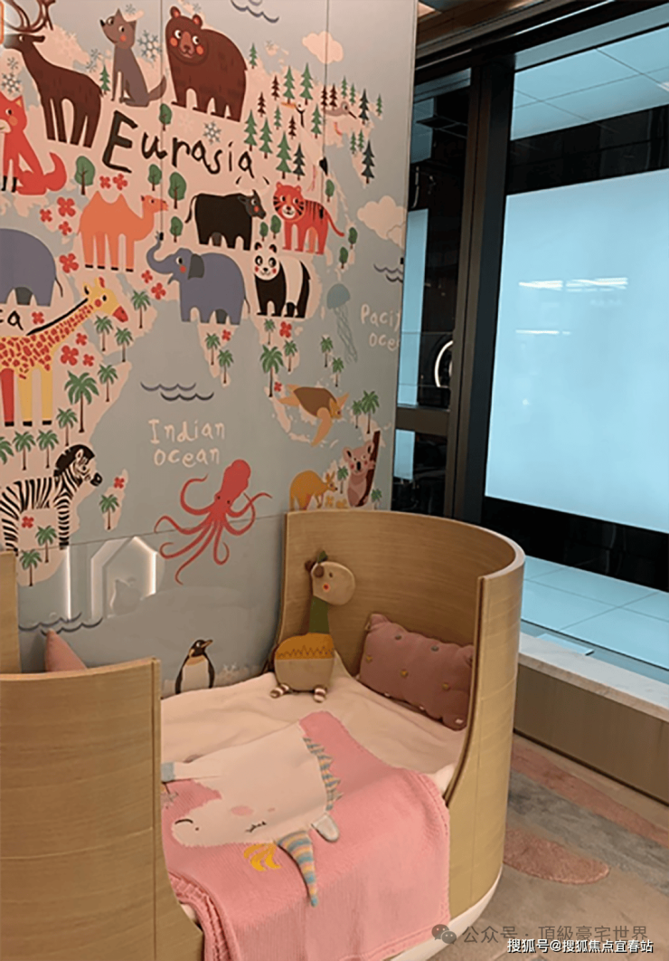 2房间隔,其中一间睡房被设计成儿童房,设有落地玻璃窗,开则方正,令空间更光猛。其中一面墙身印上不同动物,甚有童趣。儿童房内摆于上一张婴儿床,亦与主人睡房之间预留一条通道,方便住户随时可以观察婴儿情况。